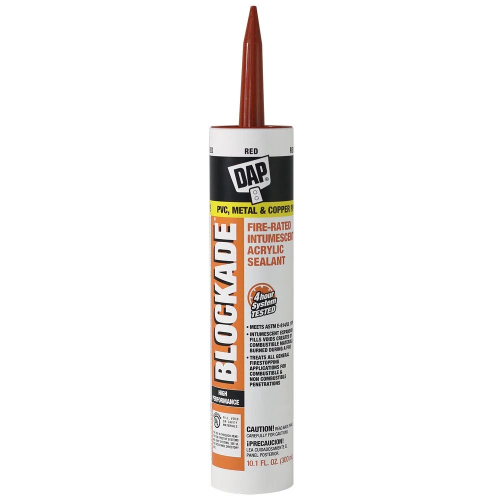 DAP BLOCKADE is a single component, water-based intumescent, acrylic firestop sealant that meets ASTM E814/UL 1479 and is 4 hour system tested. It treats general firestopping applications for combustible and non-combustible penetrations. The intumescent expansion fills voids created by combustible materials burned during a fire. BLOCKADE also has exceptional sealant qualities, such as superb unprimed adhesion, excellent flexibility, easy gunning, and is paintable once fully cured. It is low in odor and cleans up easily with water. The red color is easily recognized as a firestop sealant. Interior use.