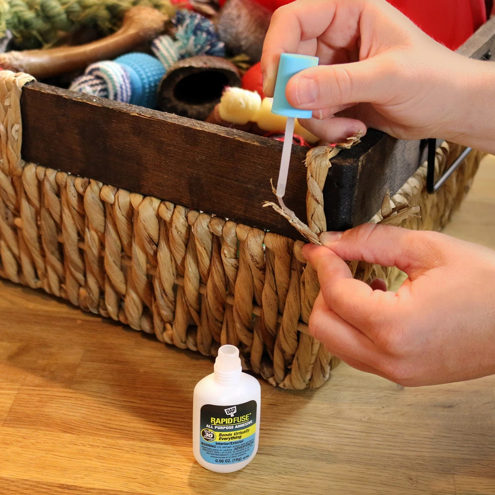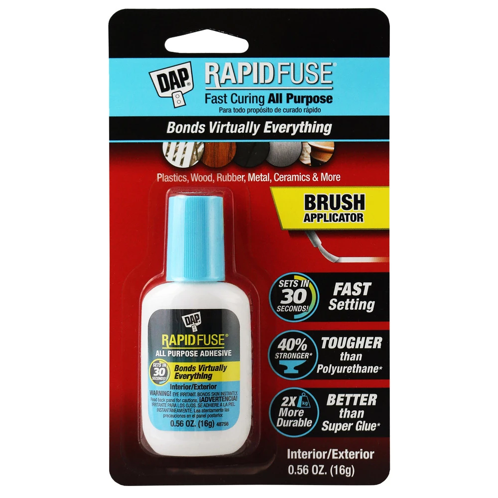 DAP RapidFuse Fast Curing All Purpose Adhesive: the latest in breakthrough technology. Easy to use. Sets in 30 seconds, cures in 30 minutes. Works on all common household materials, with a professional-strength bond that is 40% stronger than polyurethane glues. Unlike traditional super glues, and the bond won’t become brittle while delivering long-lasting durability. The bond is clear- no expanding foam, no dripping glue, no mess. Clean-up with soap & water. Indoor & outdoor use.