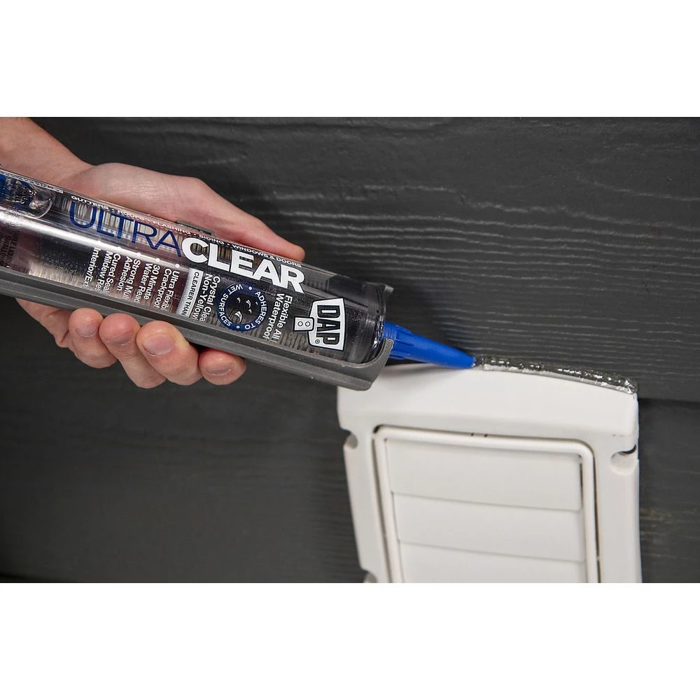 DAP Ultra Clear Flexible All Purpose Waterproof Sealant is a high performance ultra elastic, ultra clear sealant ideal for sealing a wide variety of surfaces and projects. Ultra Clear is crystal clear, allowing surface beauty to shine through and providing a seamless finish. It is clearer than silicone and doesn’t yellow, crack, crumble, chalk or break down over time, providing a 100% waterproof and weatherproof seal. It adheres to wet or damp surfaces, is water/rain ready immediately and has strong multi-surface adhesion. ULTRA CLEAR stays flexible and crackproof even in cold weather, for a long-lasting durable seal. Paintable. Interior/exterior use.