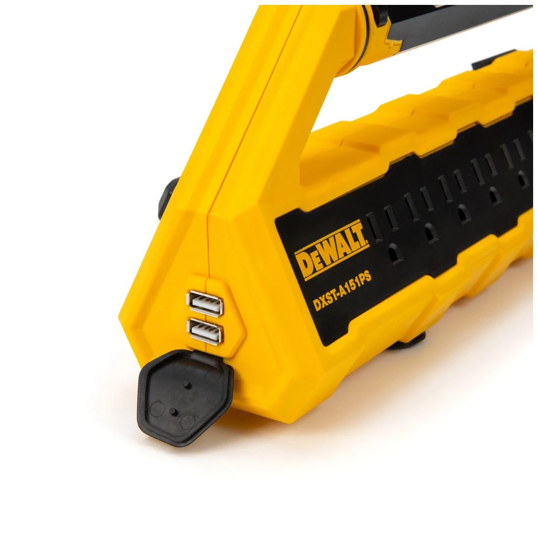 The DEWALT DXSTA151PS 15 Amp GFCI Power Station with Detachable Work Light and Cord Minder Kit is a multi-outlet accessory with a few extra features not found in standard power strips. Suited for both indoor and outdoor use, this power station features 8 standard 3-prong outlets and 2 USB outlets along with a 15-amp GFCI circuit breaker to easily power a wide range of tools and devices. A detachable and rechargeable work light is housed in the handle which itself can rotate 270 degrees allowing it to be used as a targeted spotlight to flood your work area with 500 lumens of illumination for up to four hours on a single charge. When not in use, the 6-foot power station cord can be wrapped around the built-in storage hooks on the back of the power station. The anti-skid rubber feet can be removed and the unit mounted to a wall or under a shelf / overhang or to the upright of either a DXST10000 or DXST4500 series of DEWALT industrial racks using one of the included mounting brackets. To help store additional extension cords the power station comes with a powder-coated steel cord minder bracket set. Large enough to hold up to 100-feet of heavy-duty 10/3 cable and strong enough to support up to 50-pounds, this accessory features spring-loaded, rotating end caps that allow for vertical or horizontal storage of power cords as well as easy cord retrieval. The cord minder mounts easily to the uprights of the 6 or the 4-foot DEWALT storage racks.