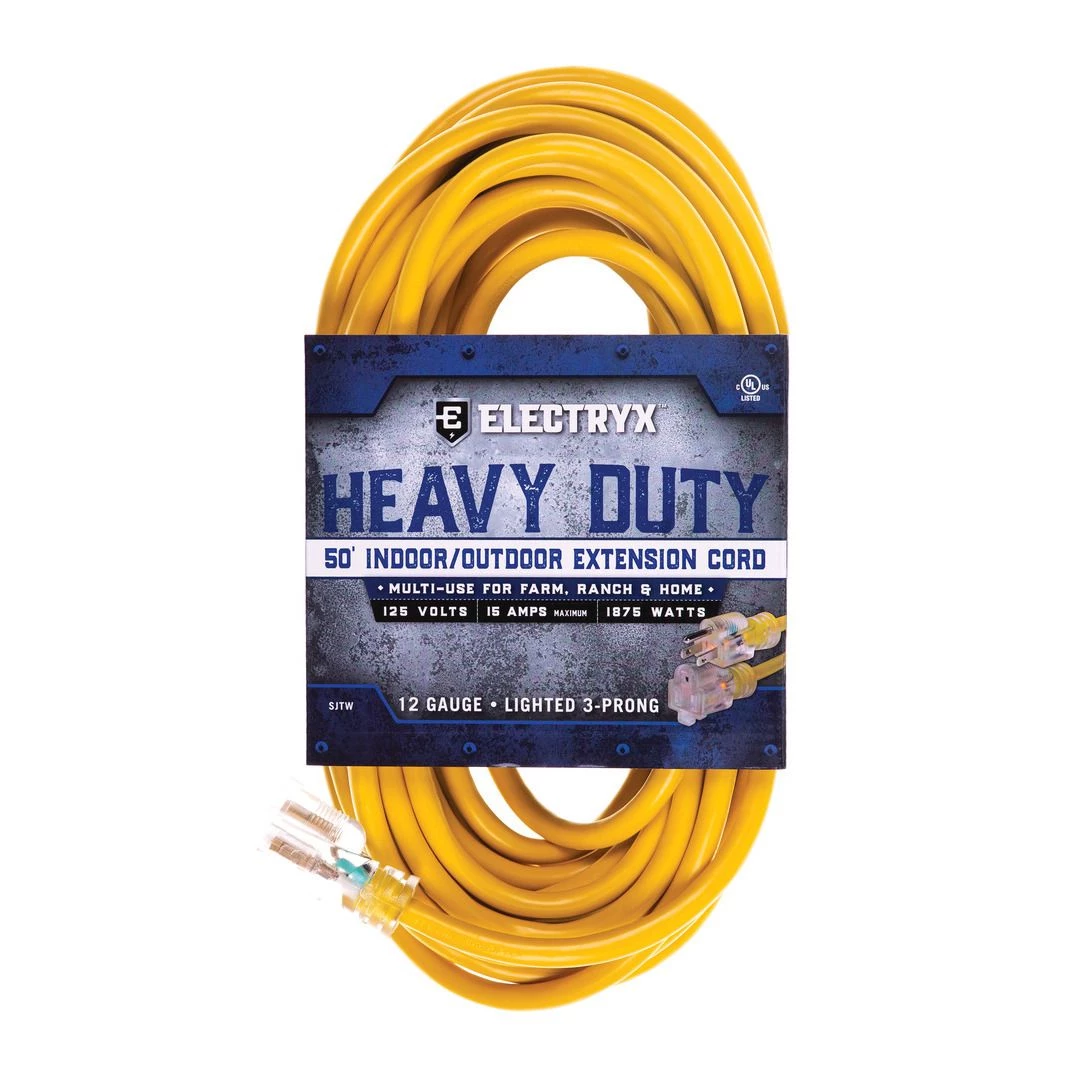 This 50 ft. YELLOW SJTW Extension Cord features a water-resistant jacket for outdoor use and a lighted end to show when the power is on. It provides power wherever you need it. This cord has a 15 Amp, 125-Volt capacity