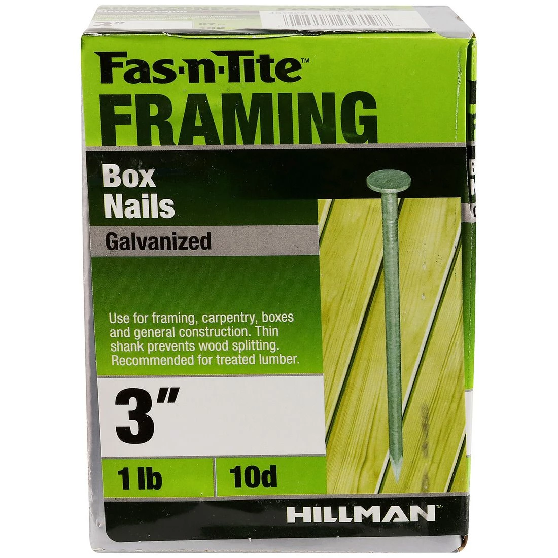 Box nails are used for framing and general construction applications. They have a flat head which sits flush on the surface when driven into wood and are usually a lighter gauge than common nails. These galvanized nails have a flat head and a smooth, thin shank to prevent wood splitting.