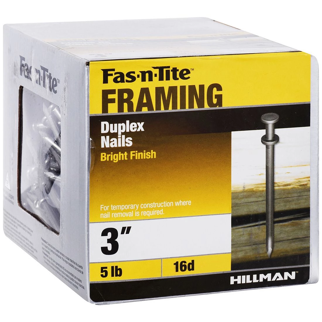Duplex nails are ideal for framing applications. The double head makes them great for temporary construction where nail removal is required. The bright finish offers an elegant appearance. We do not recommend that you use these nails in treated lumber or where corrosion is a concern.