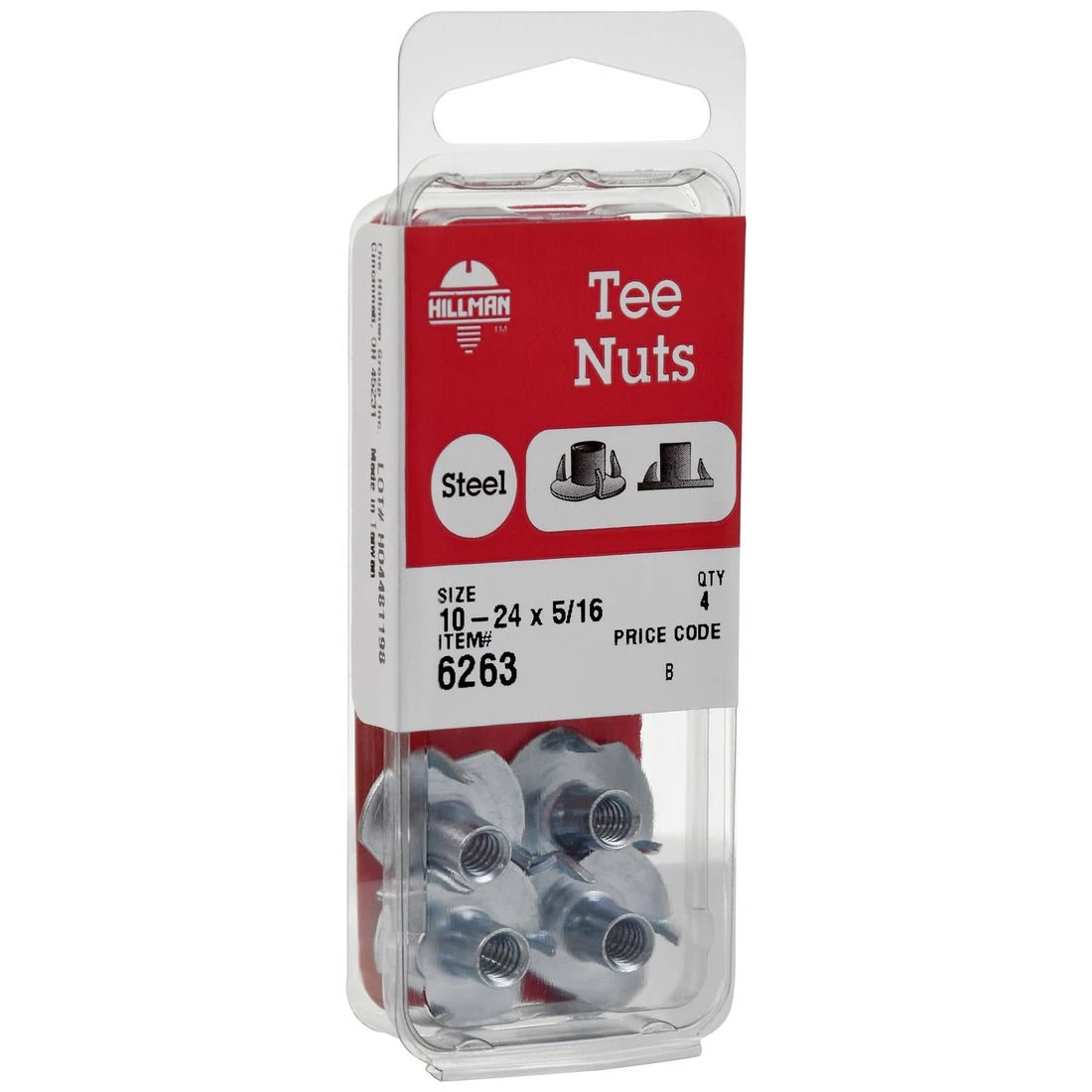 Tee nuts put steel threads into wood without counter boring. These tee nuts are barrel shaped fasteners with internal threading and are used when a flush surface is needed. They have a flat base with prong projections running parallel to the barrel. Use these prong nuts in hard or soft wood as well as plastic or particle board. Simply hammer the locking prongs into a predrilled hole until flush.
