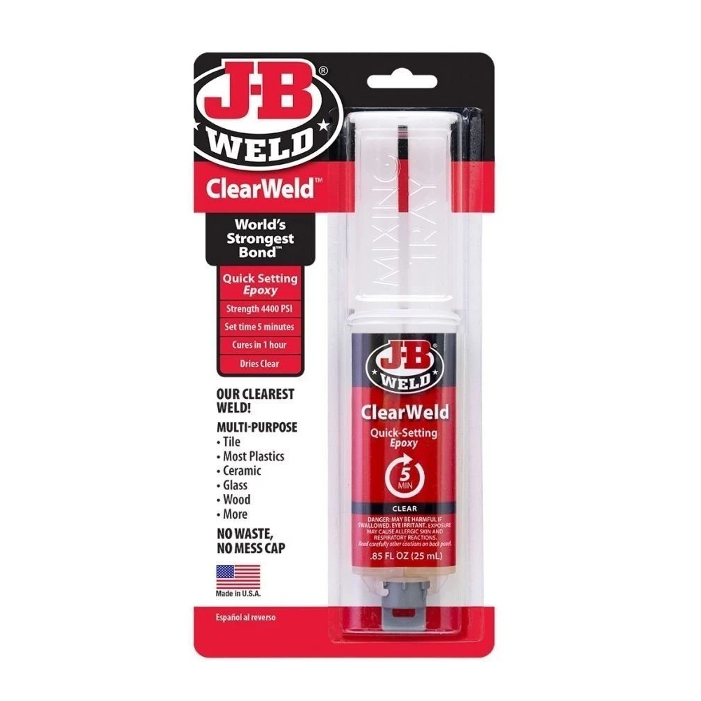 J-B Weld ClearWeld Syringe is a quick setting, multipurpose two part epoxy that provides a strong and lasting bond on most surfaces including tile, most plastics, ceramic, glass, wood and metal. ClearWeld is designed to cure with a clear, transparent bond when used at thicknesses of less than 15 mil. ClearWeld has a 1:1 mixing ratio, sets in 5 minutes and cures in 1 hour. With a tensile strength of 3900 PSI, ClearWeld sets to a hard, permanent bond.