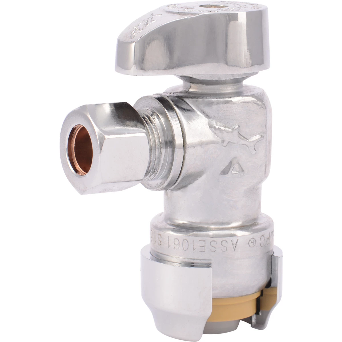 SharkBite Push x 3/8 IN Chrome Plated Angle Stop Valve, 1/2 IN Compression, 23036-0000LF