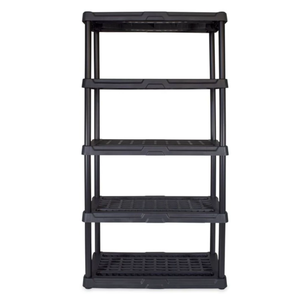 Fundamentals Black 5 Tier Ventilated Shelf Unit Manufactured of heavy-duty high-impact resin. Assembles in minutes. Shelf will not rust, stain, peel, or dent. 150 lb. shelf capacity. Elevated from floor for garage or outdoor use. Unit measures 72 H. x 36 W. x 18 D. 4 tier shelf contains wall brackets only. No feet or caps included