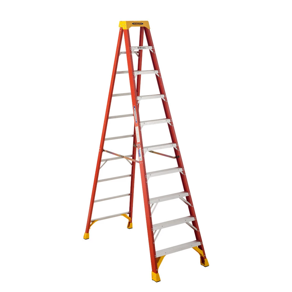 The 6210 Fiberglass 10 ft Step Ladder is ideal for the homeowner or the professional. With a duty rating of 300 pounds, it features a HolsterTop with the Lock-In System to secure tools from falling while keeping them right at hand. The ladder offers a full set of rear horizontals and heavy duty internal spreaders. All steps are knee braced and the foot pads are riveted to the EDGE structure. The EDGE bracing system helps protect the rail from damage. Each TRACTION-TRED step is slip resistant and double riveted. Fiberglass rails are non-conductive for working near electricity.