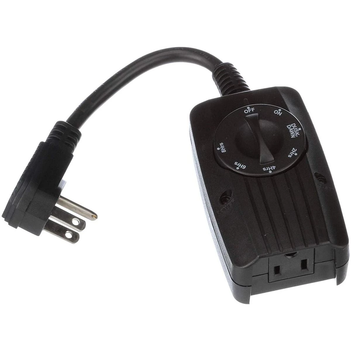 - Turns lights on at dusk and off at dawn or off after 2, 4, 6 or 8 hours, settings repeat daily Controls yard lights, patio or seasonal decorations 2 Weather resistant construction, CFL Compatible, cUL listed, comes in black with a 6-inch cord