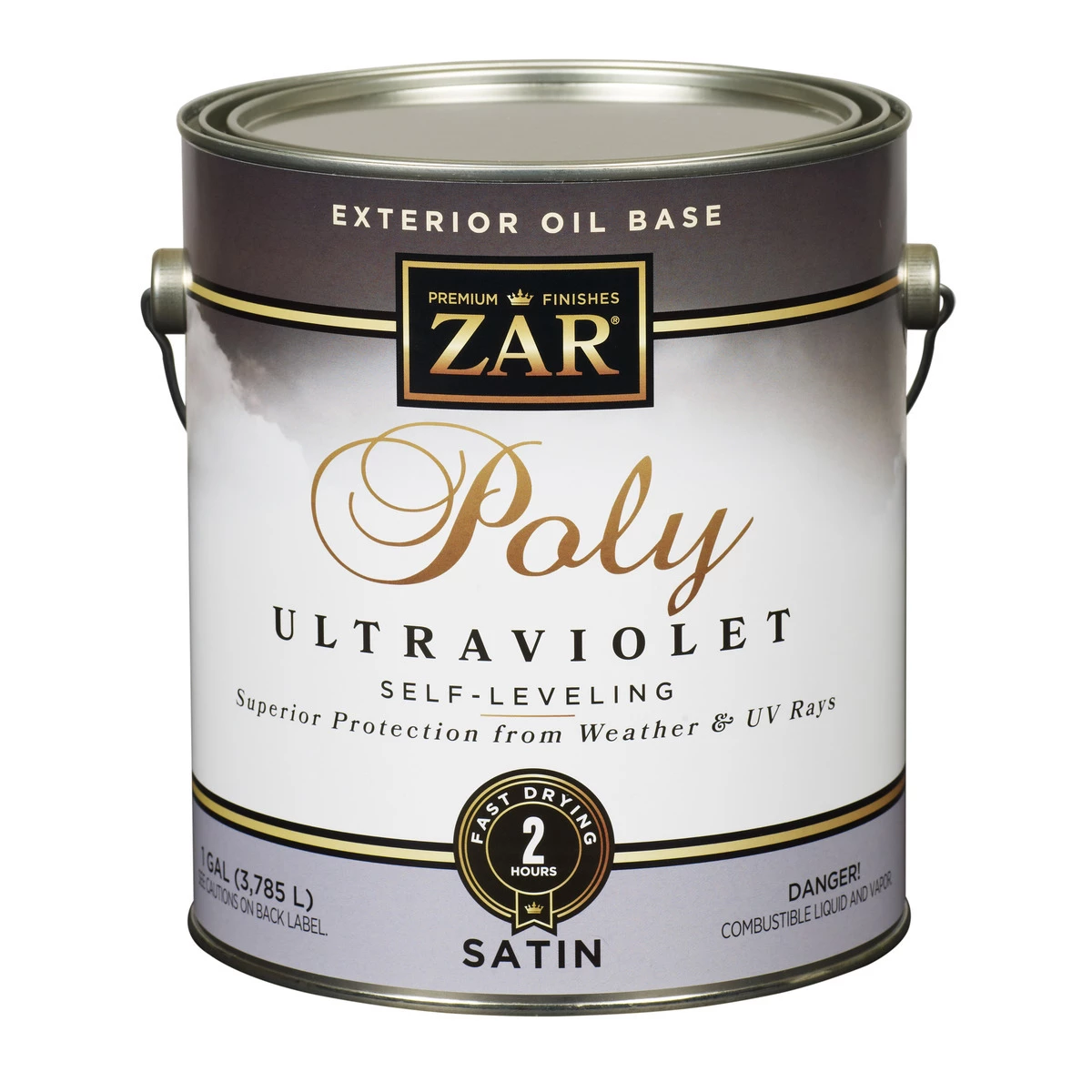 - Environmentally safe, ZAR Exterior Water Base Poly High Performance is the perfect finish for surfaces exposed to direct sunlight and the harsh extremes of weather. The full-bodied formula brushes on like a conventional (oil-based) polyurethane for maximum durability and beauty. Light amber finish, Recommended by leading door manufacturers, excellent marine-grade finish, Soap and water cleanup, 500-600 square feet per gallon, Application tools: foam brush, synthetic fiber brush, Dry time: 30 minutes to touch, Coats: 3, Recoat: 2-3 hours